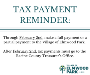 Last Day to Pay Property Taxes to Village Office – Feb 2nd Posted on January 28, 2026January 28, 2026 by Admin Last day to pay your property taxes to our Village office is Monday, February 2nd. Any payments after that date will need to go directly to the Racine County Treasurer’s Office.
